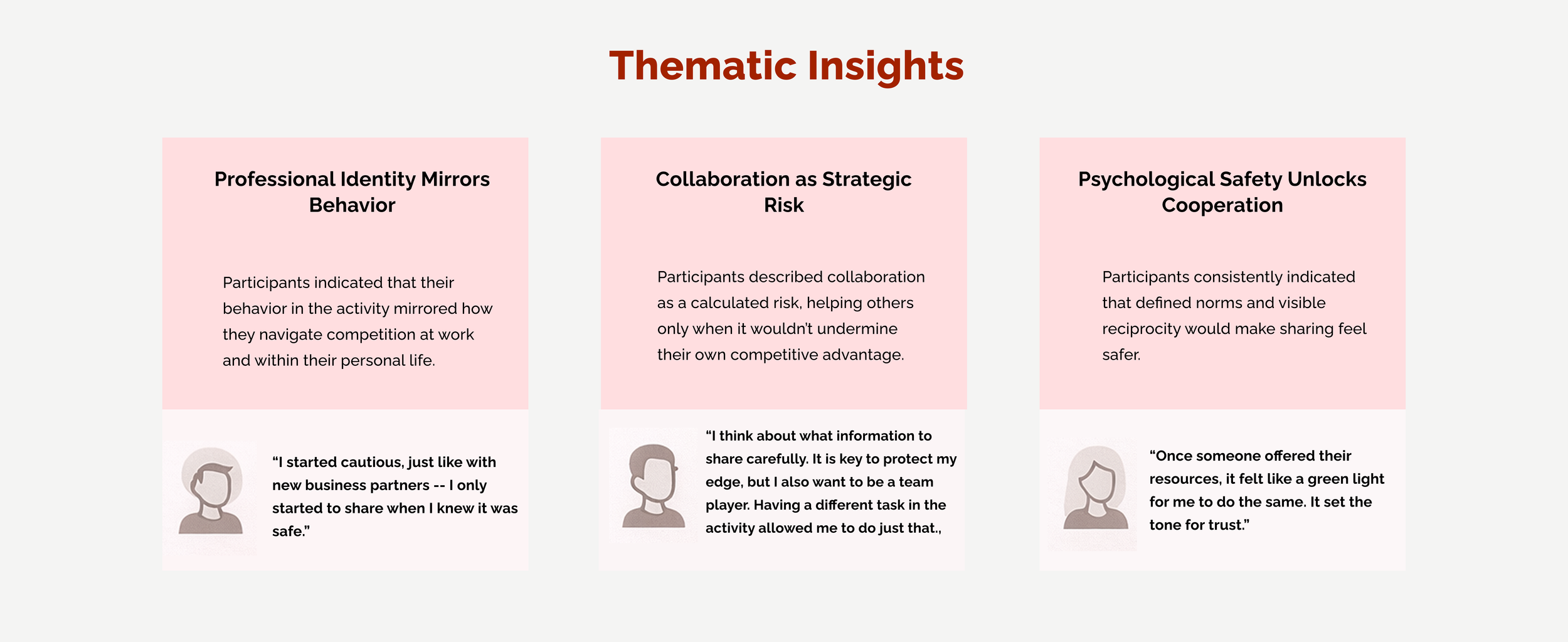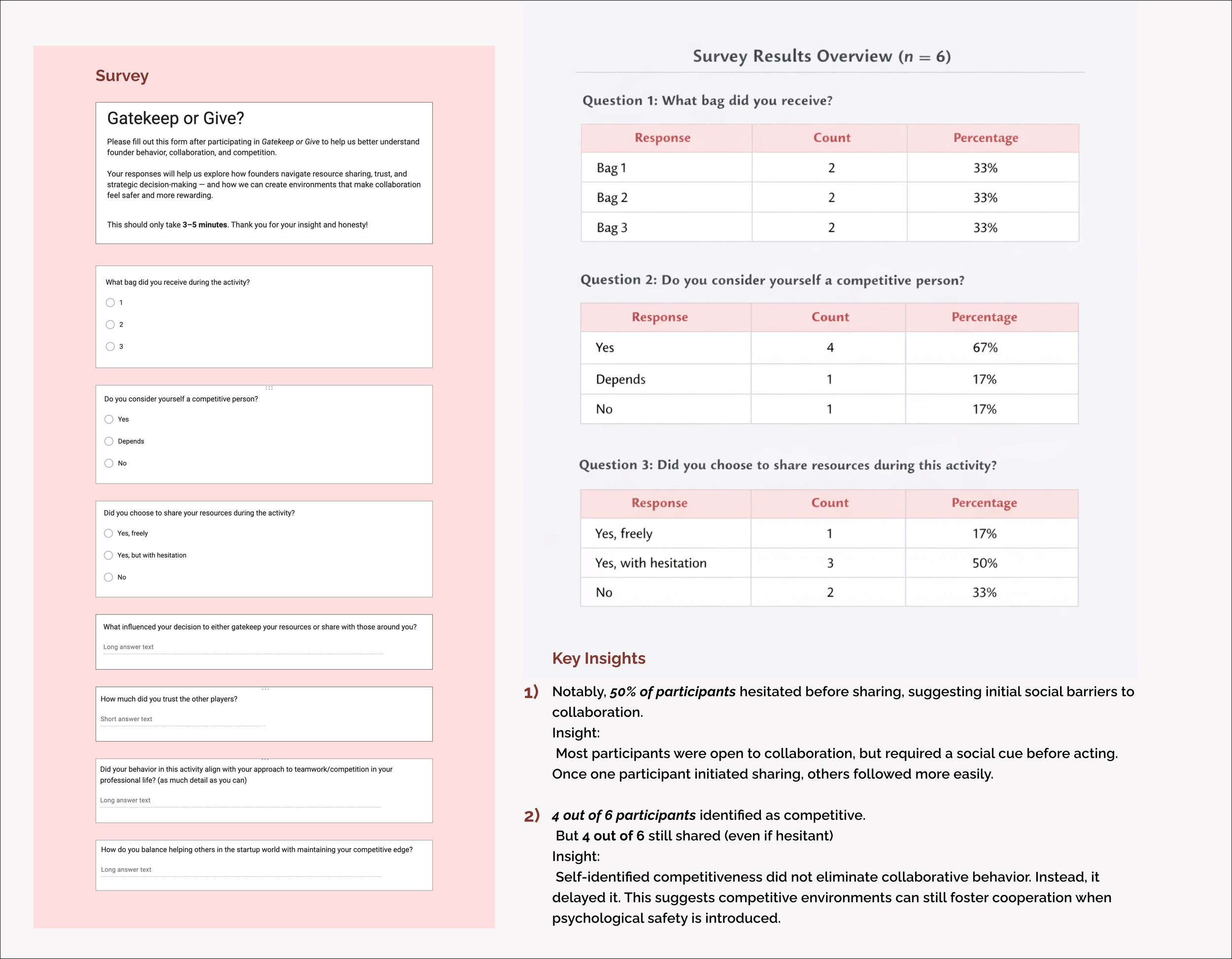 At the conclusion of Gatekeep or Give, I deployed a post-activity survey to collect both quantitative and qualitative data on participant competitiveness, sharing behaviors, and perceived social dynamics. These findings were synthesized to identify behavioral trends and inform evidence-based iterations of our final design solution.