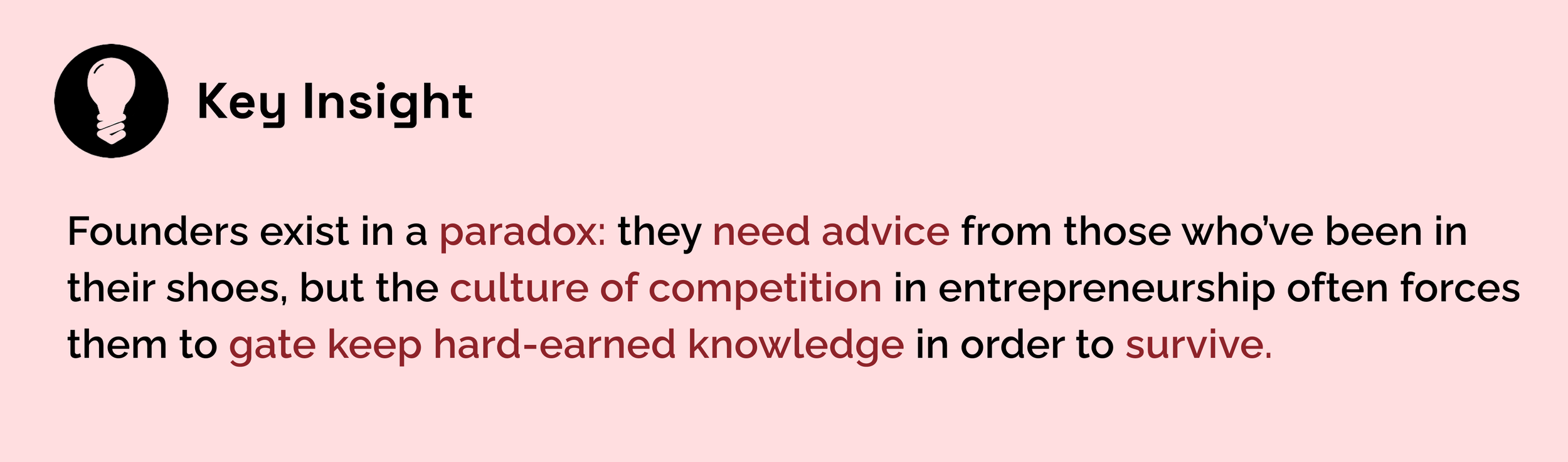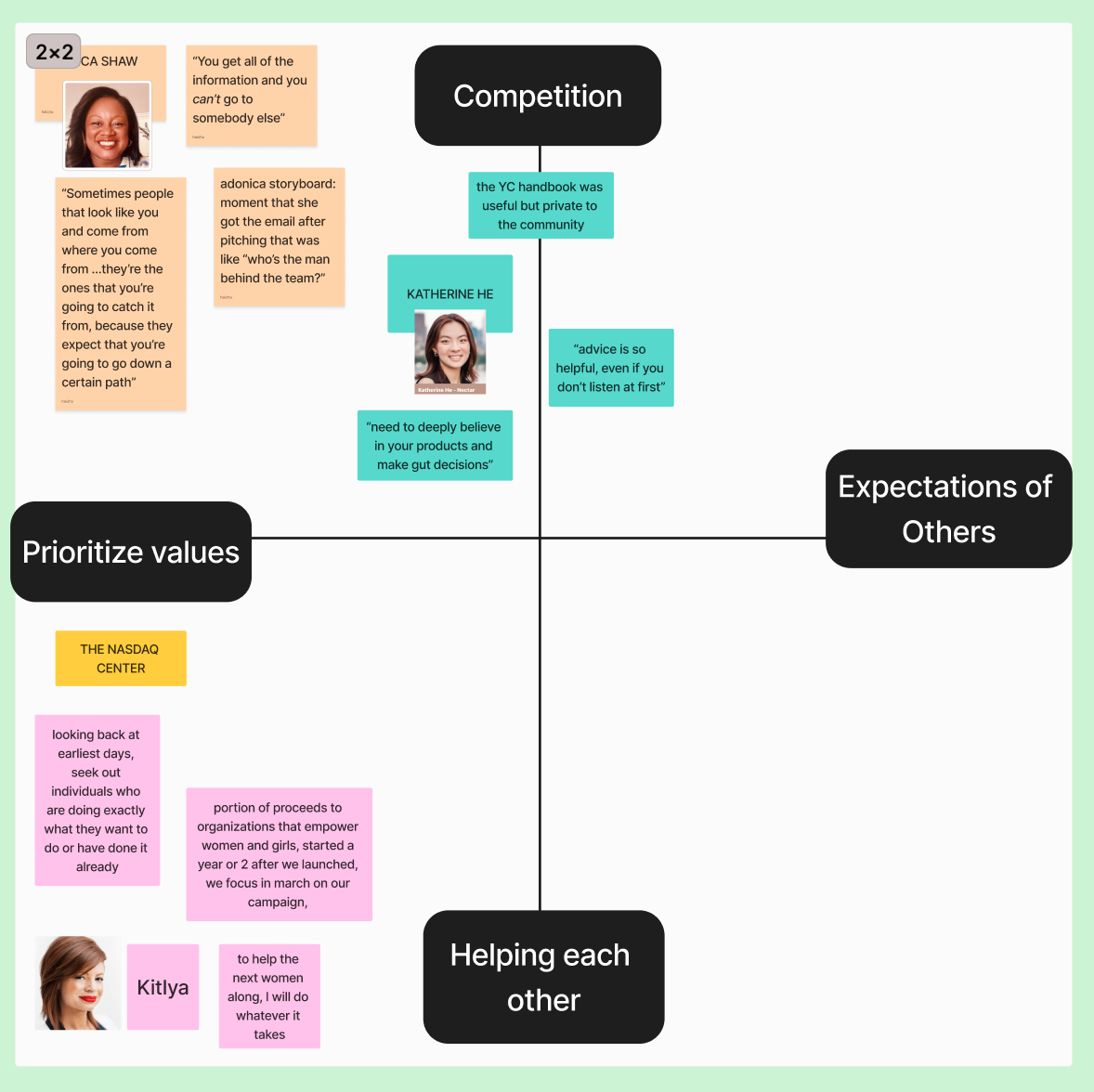 We used a 2x2 matrix to compare tensions and pain points across our users. One key tension was the balance between being as competitive as possible to advance your company while also helping others who were once in your shoes. Another was maintaining core values, as growth often brings external pressures to prioritize profit and success over the principles that define the business.