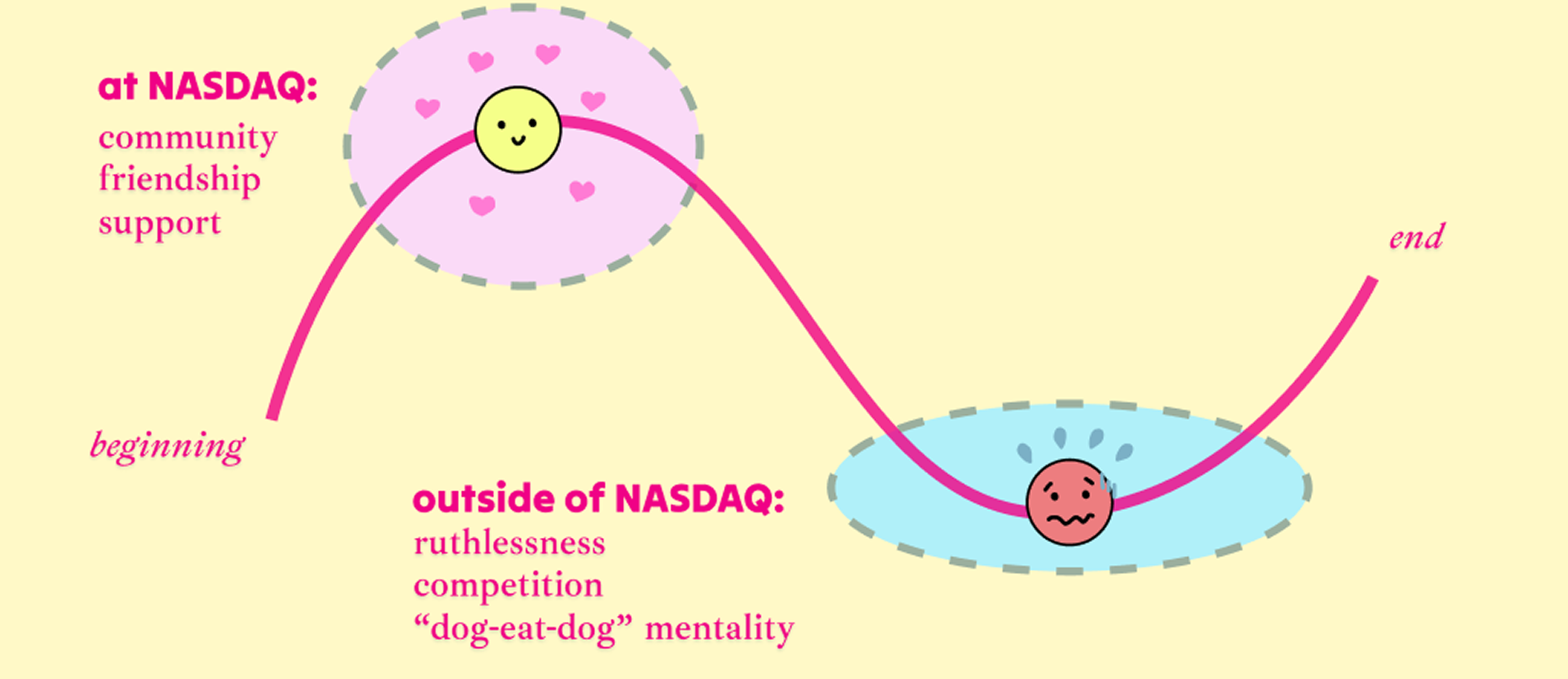 Another key tension emerged between the supportive environment of the NASDAQ Center, where founders are encouraged and guided, and the competitive, 'dog-eat-dog' reality of the broader business world.