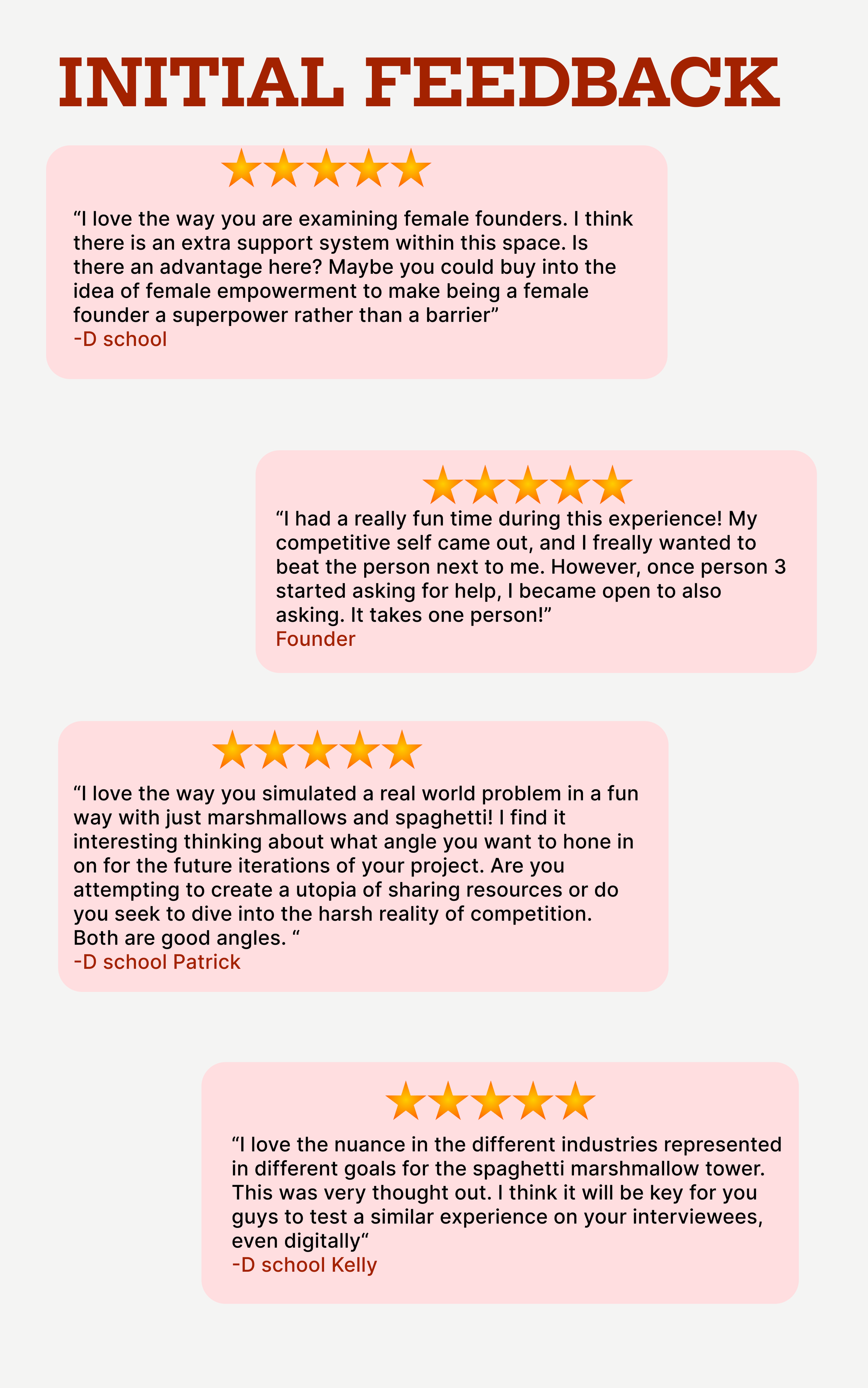 Midway through the project, we held 'Prototype Experience Day' at the d.school, where 40 founders tested our prototypes. Preparing for this, we created three different prototype ideas. I will focus on the one I developed individually. These prototypes were designed to test insights, not serve as final products. We utilized this research for pitching our final recommendation to leadership.