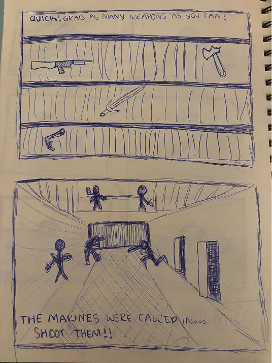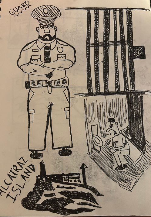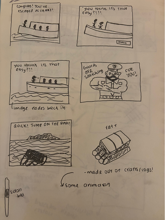 Using my sketches, I translated my hand-drawn concepts into digital graphics in GoodNotes for our interactive experience. One of these sketches—the guard character—became a key component of Escape Alcatraz, helping bring the narrative and environment of the experience to life.