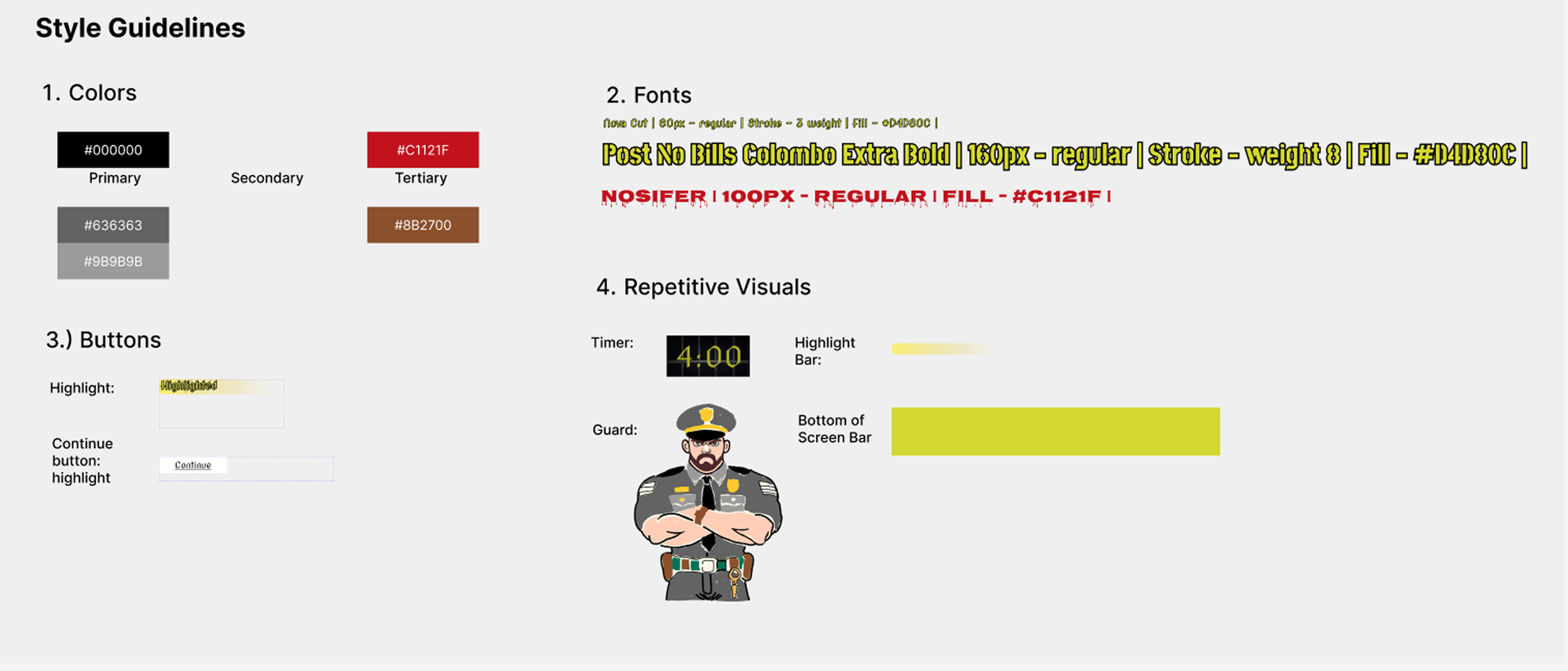 This style guide was developed to support the narrative and immersive tone of Escape Alcatraz. Inspired by the history and atmosphere of Alcatraz, the visual system uses a restrained color palette with bright accent colors of red and yellow, bold typography, and graphic elements that evoke authority, confinement, and tension. These decisions helped create a cohesive experience across all touchpoints while keeping the interface clear and intuitive for players under time pressure.
