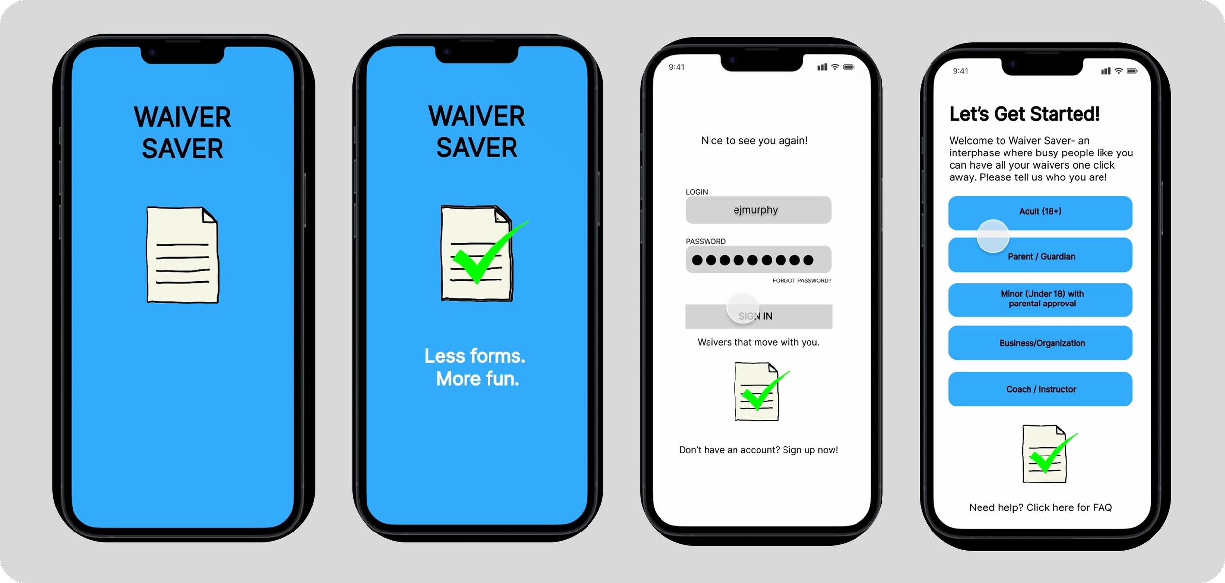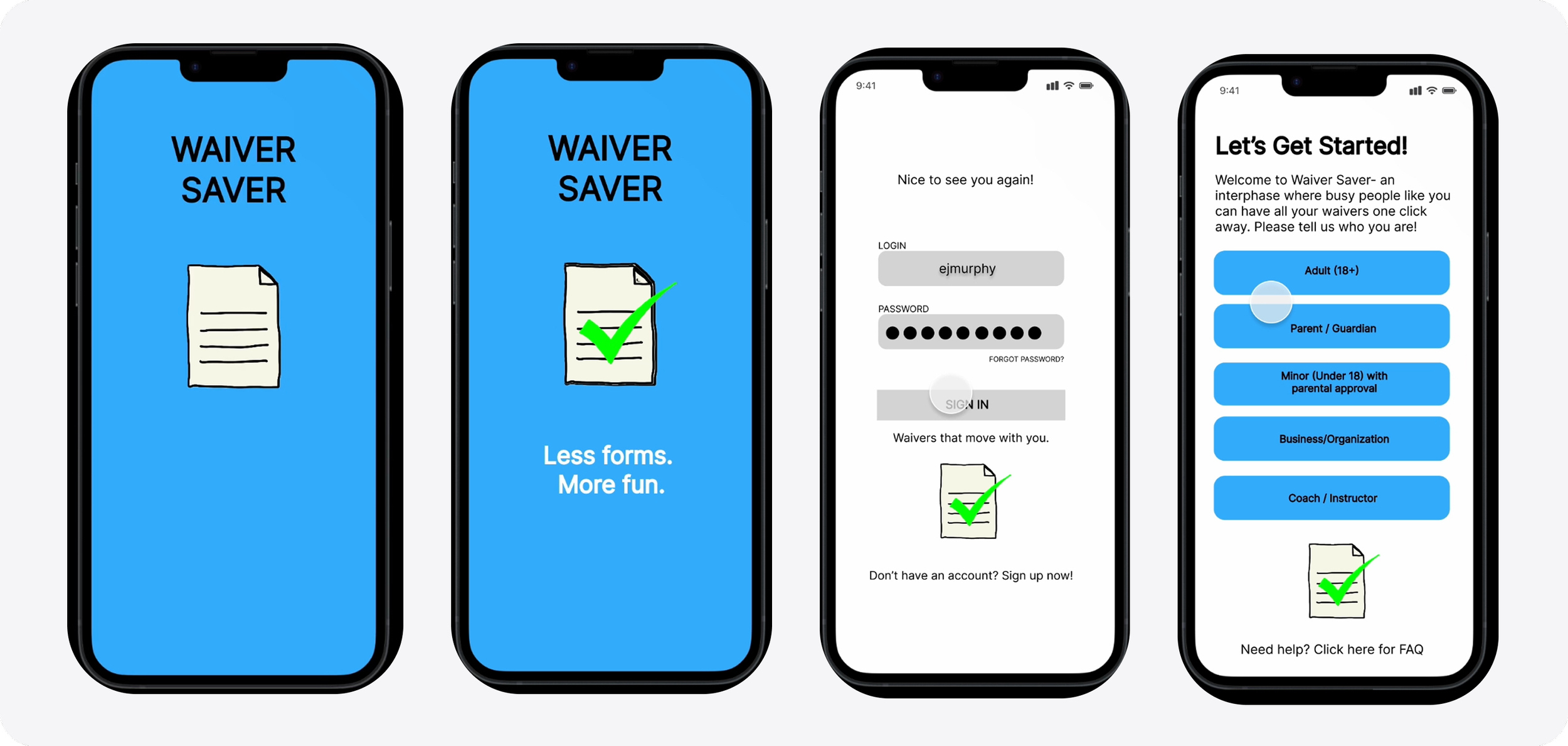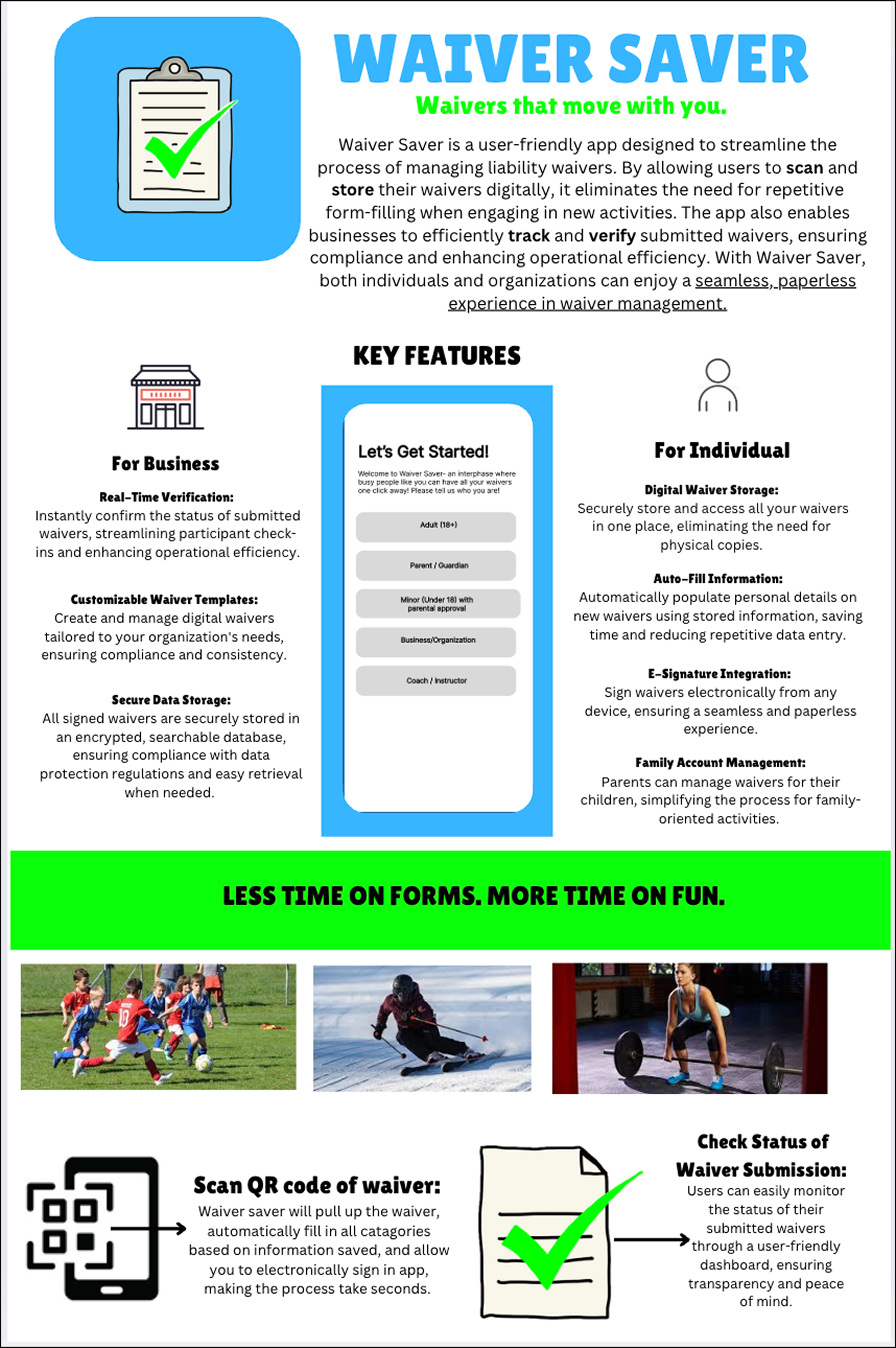 The app allows users to securely store, auto-fill, and electronically sign waivers, making it easy to submit required forms in seconds. For businesses and organizations, Waiver Saver enables real-time verification and tracking of submitted waivers, simplifying check-ins and improving operational efficiency. By serving both individuals and organizations, the concept creates a shared system that reduces paperwork while increasing clarity and compliance.